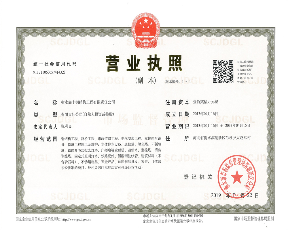 衡水鑫豐鋼結構工程有限責任公司建于 2003年, 技術力量雄厚 , 專注生產(chǎn)鋼結構鐵塔系列產(chǎn)品 。本廠具有鋼、鋁塔設計,制作以及鑄造、鉚焊、鍛壓、熱鍍鋅、防腐等綜合制作能力,在設計、制作、安裝以及專用設備方面有豐富的經(jīng)驗。